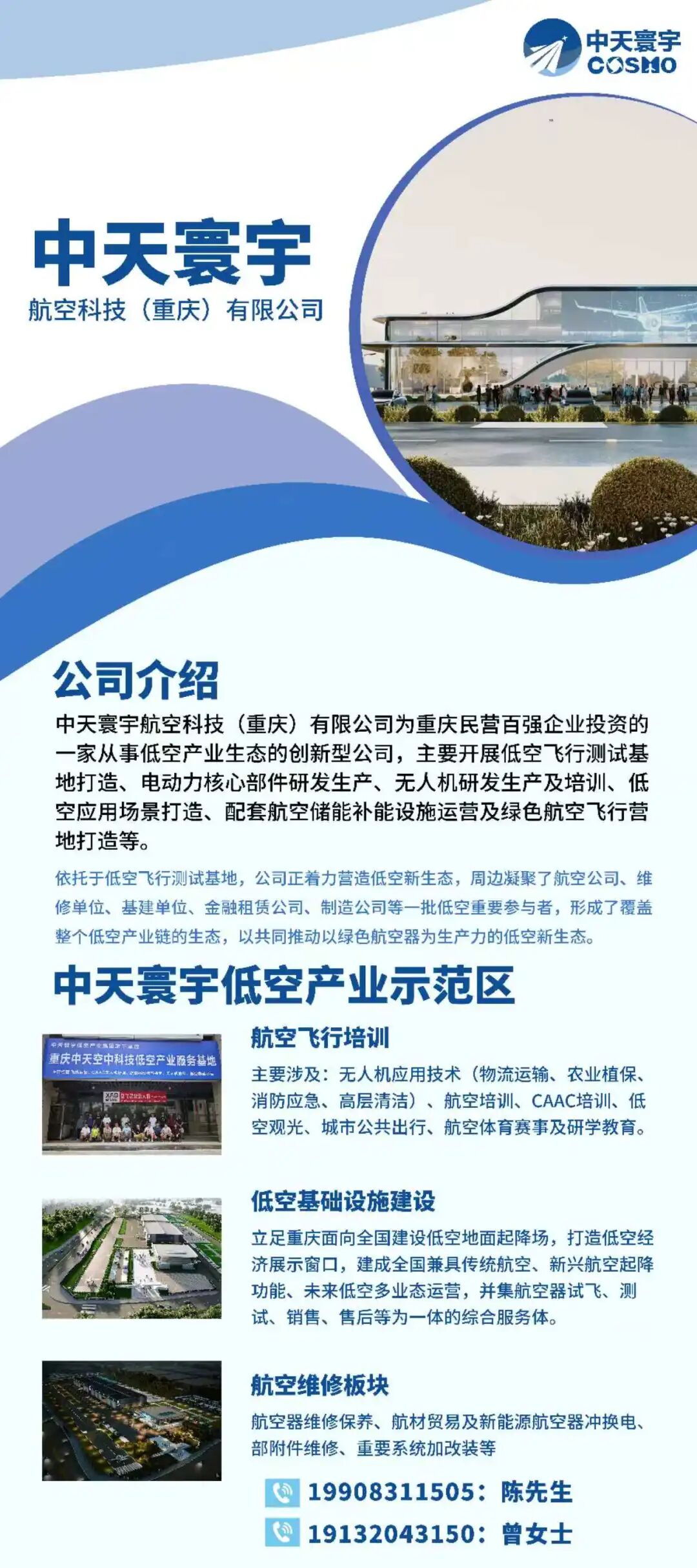 中天寰宇航空科技(重庆)有限公司为重庆民营百强企业和大型国有企业共同投资的一家从事低空产业运营服务的公司,公司按照“一体两翼”的战略布局,即试飞基地+低空产业园为“一体”、以航空教育及低空科技为“两翼”,大力开展无人驾驶航空器研发和应用技术开发、销售、民航无人机执照培训、货运级eVTOL研发生产、电动力核心部件研发生产、配套航空储能补能设施运营等服务。