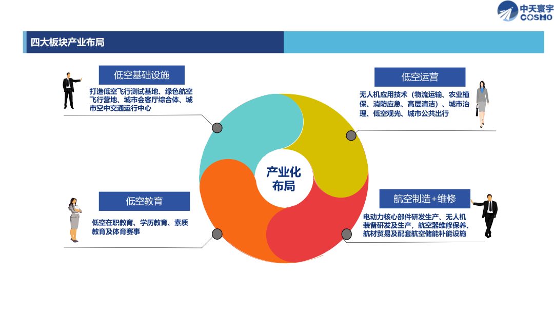 三、低空教育板块:构建完善的低空教育体系,涵盖低空在职教育、学历教育、素质教育及体育赛事,培育低空产业专业人才,为产业发展提供坚实的人才支撑,助力行业人才梯队建设。